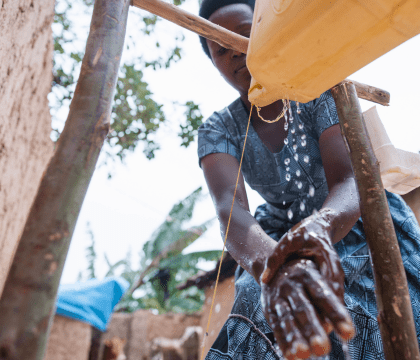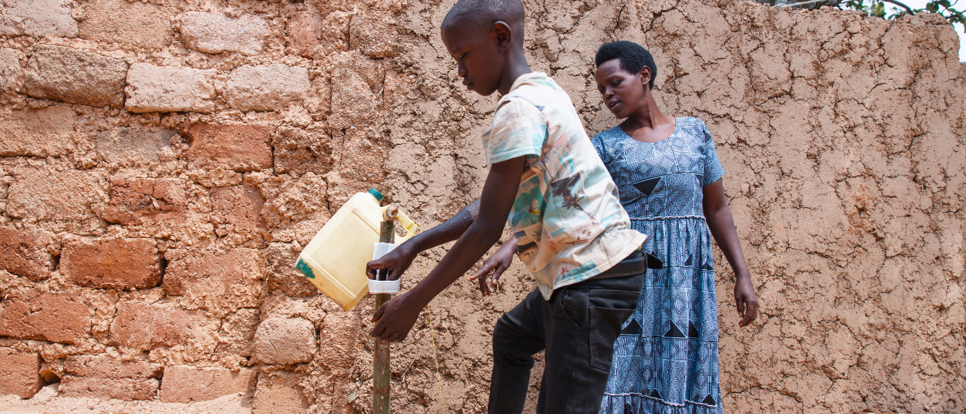 PHOTO: Josephine observes her son's use of the tippy tap installed beside their latrine—reminding her family daily of the power of handwashing to prevent disease.