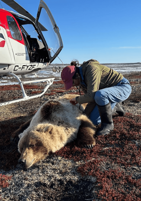 Dr. Jutha examines a tranquilized grizzly bear that has been translocated to the tundra for human-wildlife conflict management purposes.