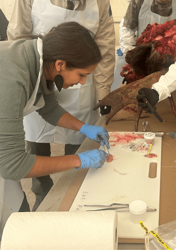 Dr. Jutha works with Indigenous guardians, community harvesters, and wildlife officers to train in sample collection methods as part of a community-based Chronic Wasting Disease monitoring program.
