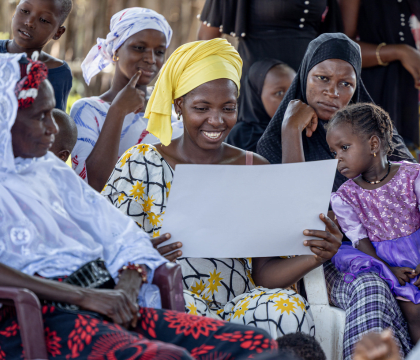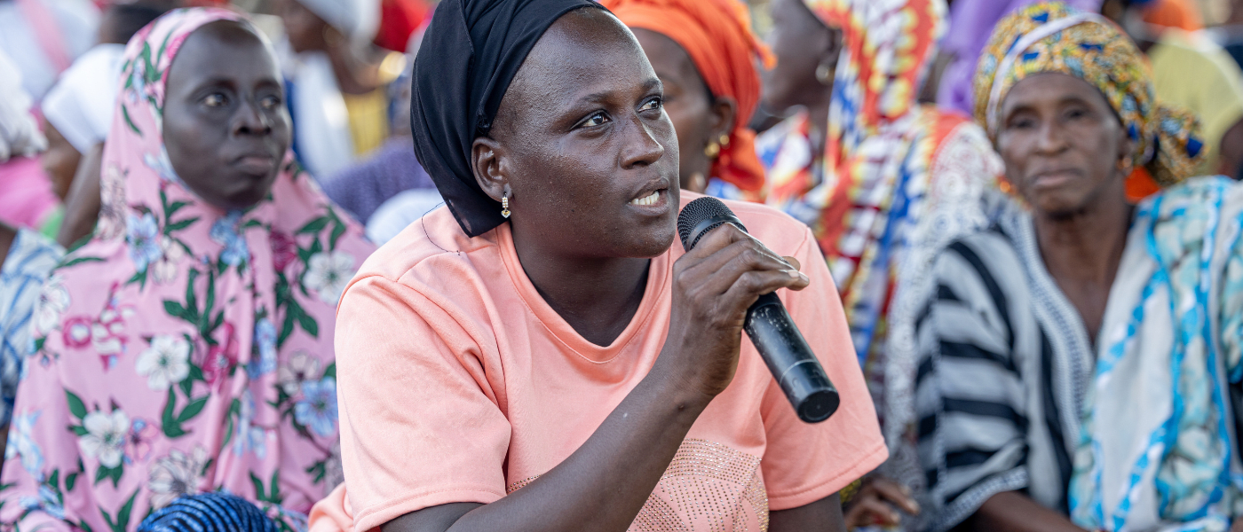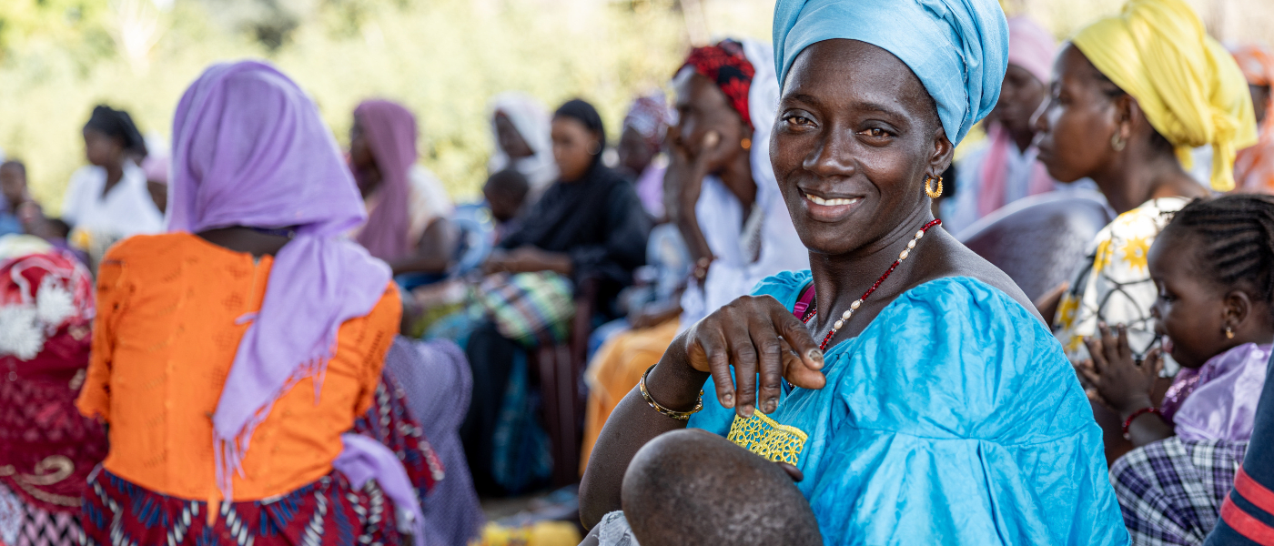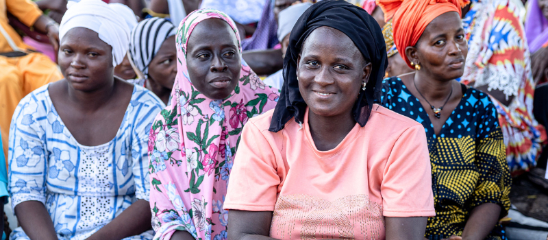 PHOTO: Khadia Diallo (far right) joins women from the community during the sensitization session — a familiar face among peers.